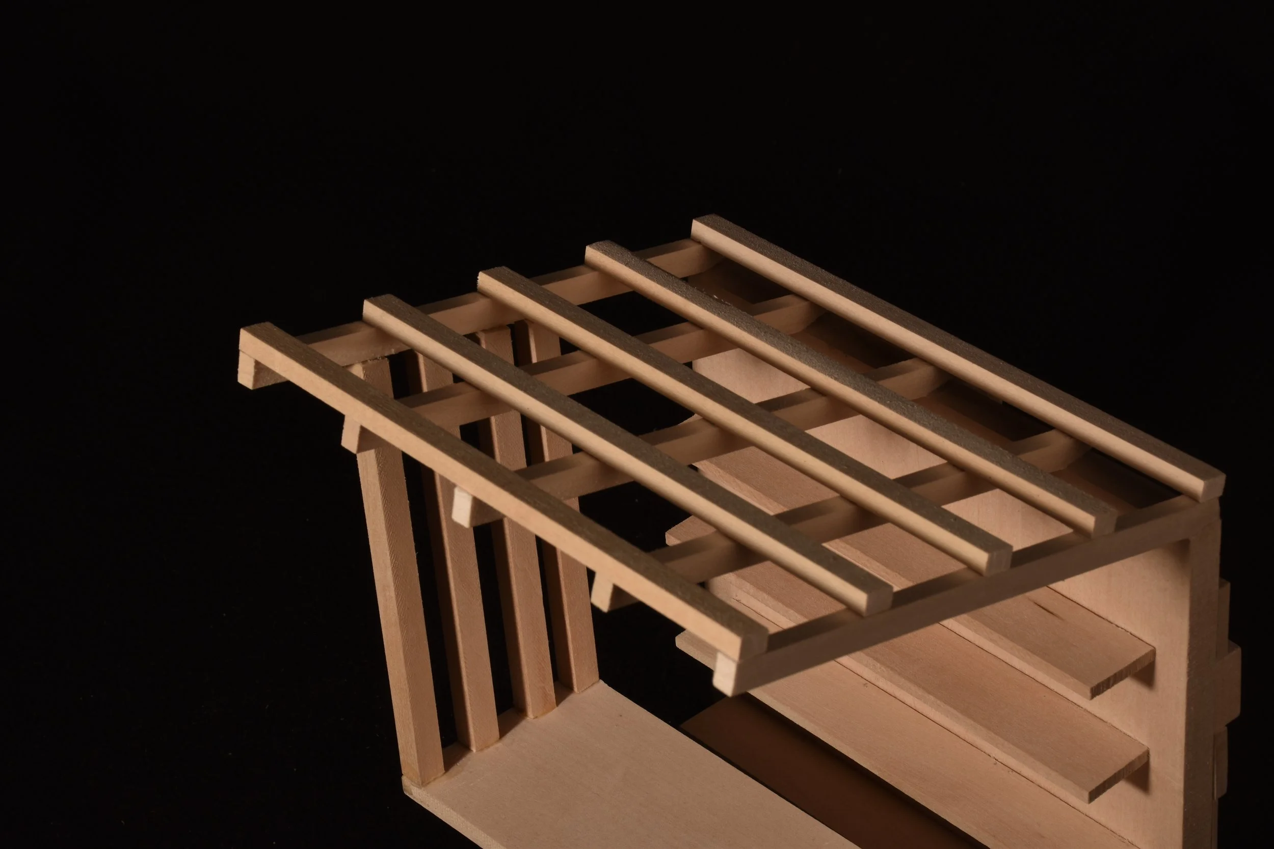 The paneled back wall with oak wood planks of varying thicknesses serves a symbol of ingenuity. The cantilevered awning provides support for the table below. Its lattice structure is versatile, providing large amounts of light when left bare or serving as a medium for botanical elements and shade when cultivated. The wooden table connects to the orthogonally constructed roof via four thin beams that meet at the left end. The table constitutes as a part of the overall structure, signifying the interdependence between itself, the wall, and the awning. It is supported by the four beams on either side to represent balance while also encapsulating the unconventional beauty of the creative process.